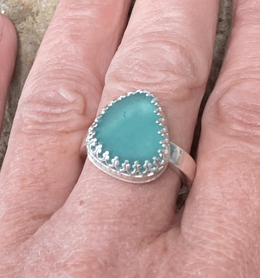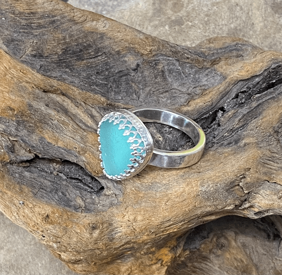 Envelop your spirit with the serene essence of the sea with our handcrafted sterling silver sea glass ring. This unique piece captures the pure, tranquil beauty of ocean waves.